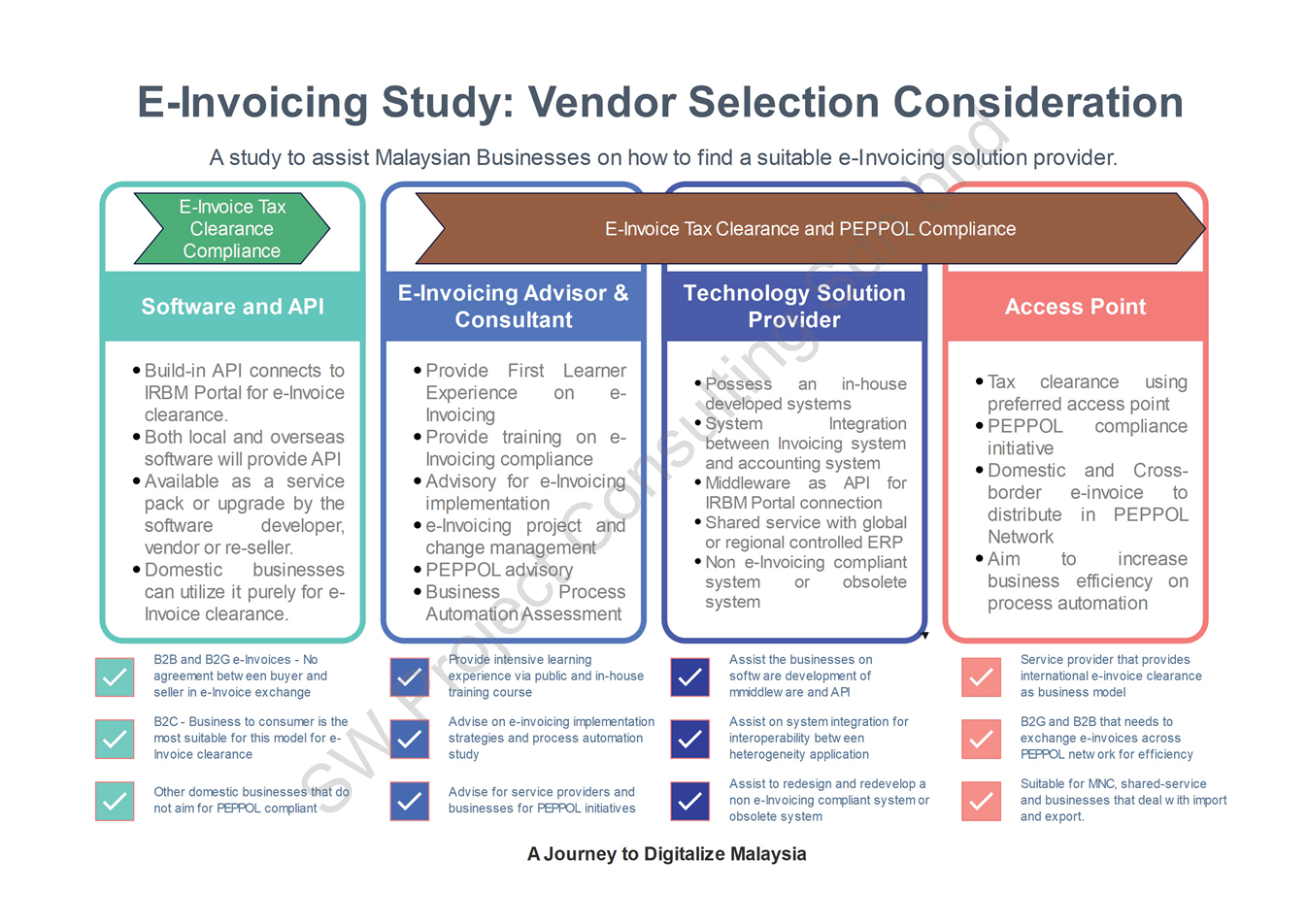- It is able to fit the businesses who opt for tax compliance via e-Invoice clearance and PEPPOL interoperability implementation. The businesses shall engage these advisors to monitor the timeline and deliverables.