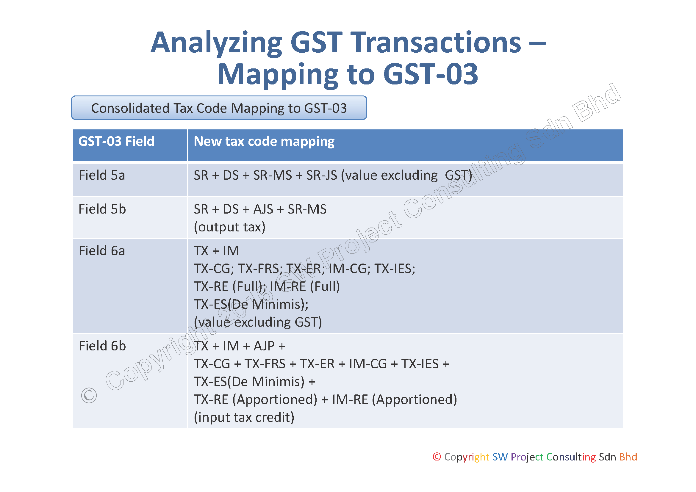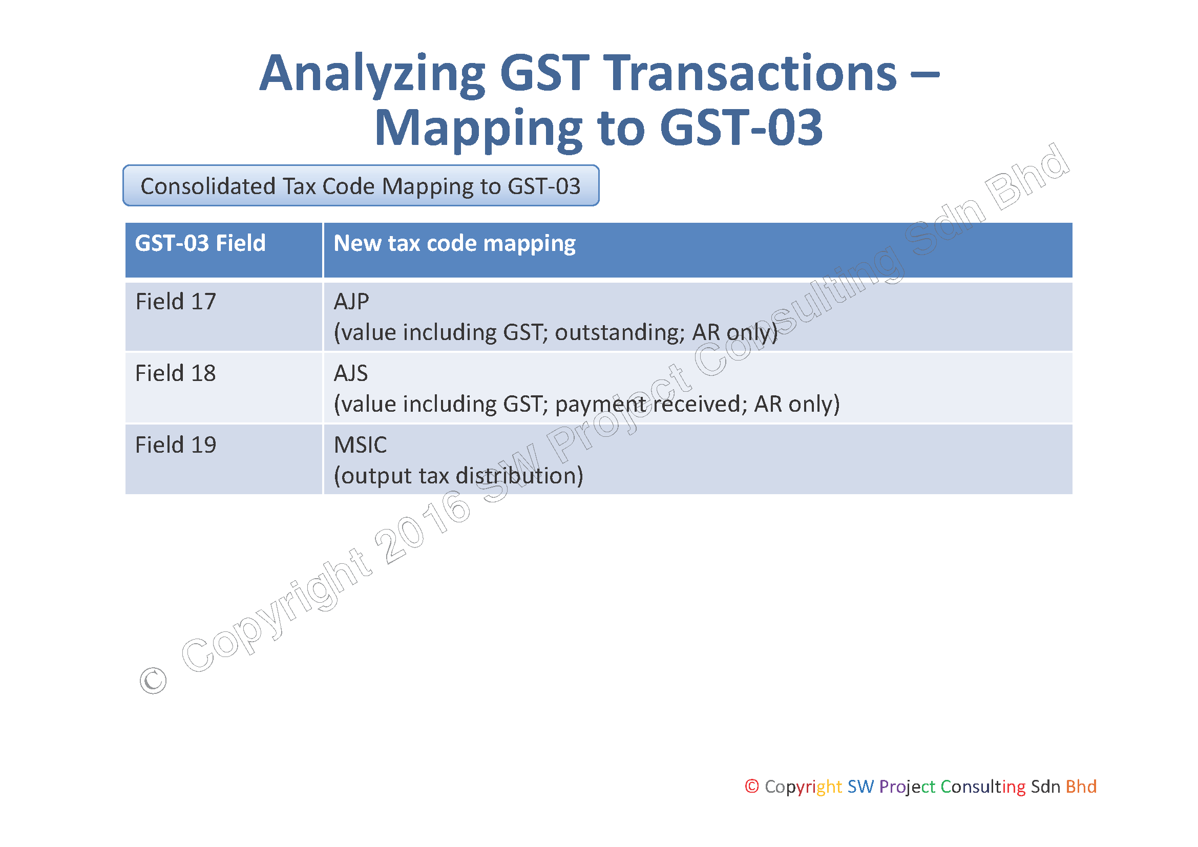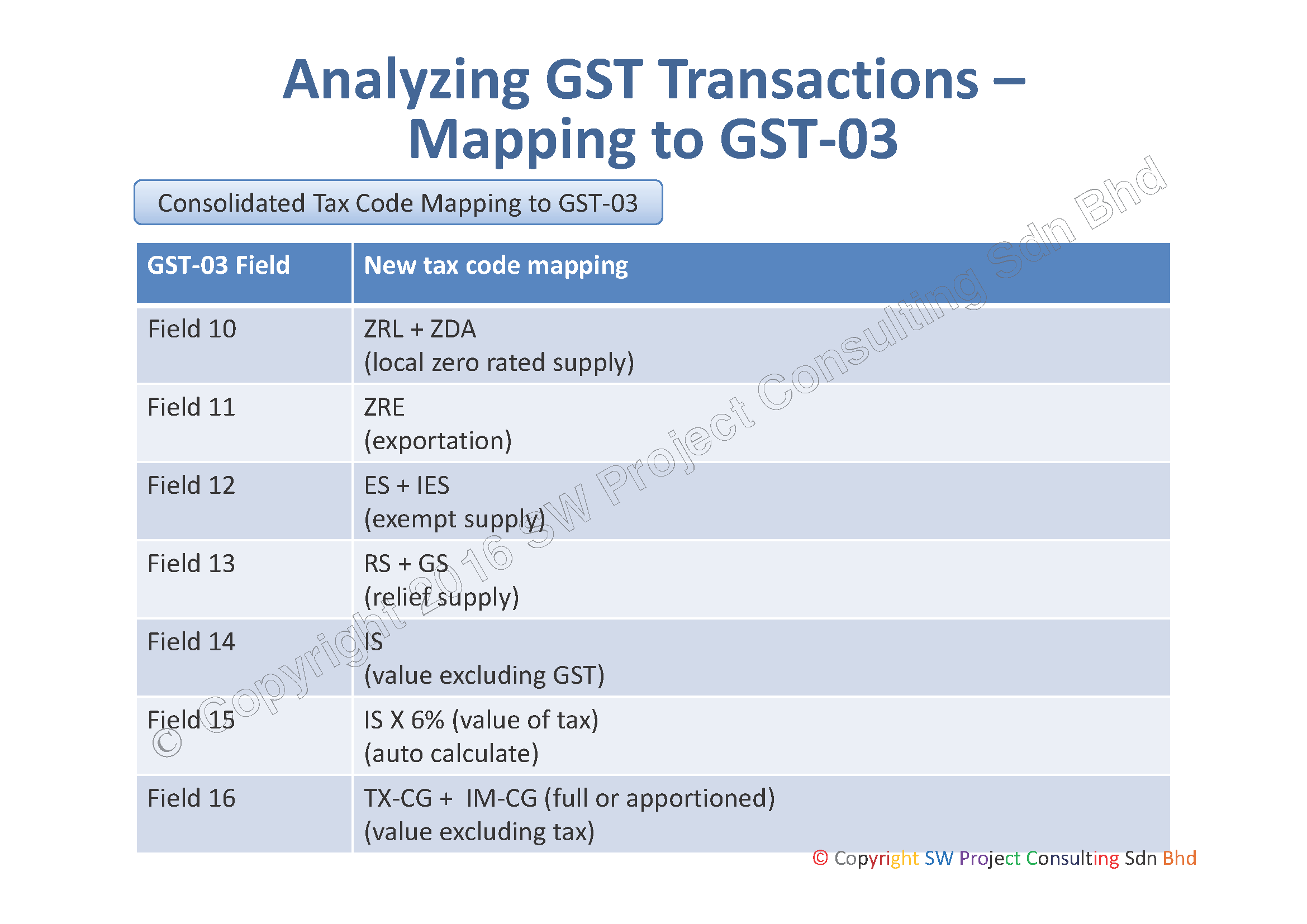 RMCD introduced new tax codes on 01/08/2016. Some tax codes require disclosure in GST-03. Here is the summary for the tax code mapping to the GST-03 fields. There are three slides together.