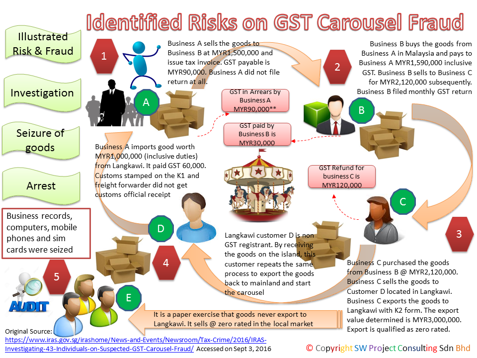 GST Carousel Fraud is a recent GST investigation case in Singapore on Aug 15 and 16, 2016. There were 43 people arrested. IRAS seized computers, SIM cards, mobile phones and business records in the opereation. IRAS viewed the GST Carousel Fraud as a serious event that leads to tax evasion with wilful intent.