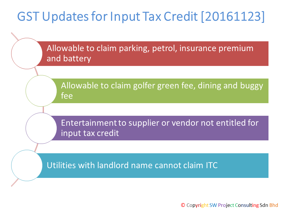 The diagram below is the selected common changes for all GST registrants. There are new addition, amendments and deletion of paragraph and example related to the previous guide on input tax credit [20151229]
