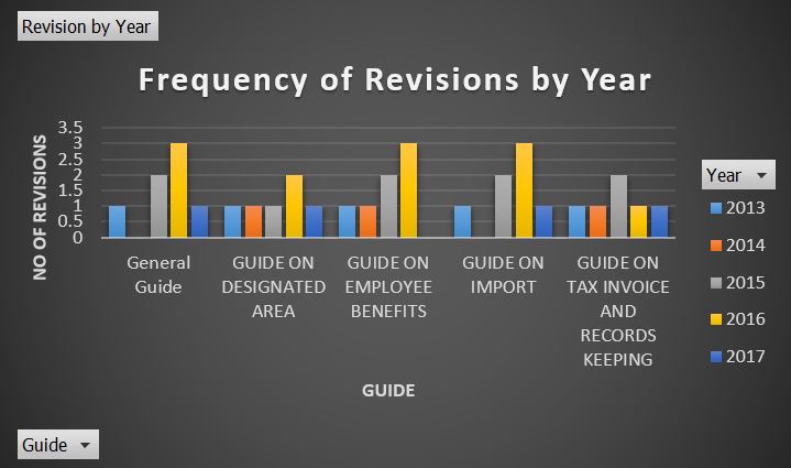 This summary is to analyze the frequency of GST Guide Revision since 2013. There are total of 209 revisions for 90 selected GST guides as at 06/02/2017. The summary of revision frequency will continue to update but will publish on yearly basis.