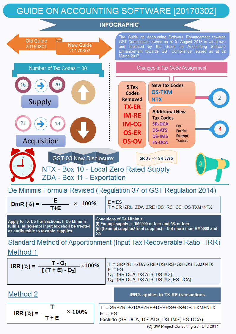Guide on Accounting Software Enhancement towards GST Compliance was revised as at 02 March 2017 and replaced the existing Guide on Accounting Software Enhancement towards GST Compliance as at 01 August 2016. In this new guide, some tax codes have been removed and it also added new tax codes, thus currently it has a total of 38 tax codes. In addition, the De Minimis formula and standard method for Input Tax Recoverable Ratio have been revised.