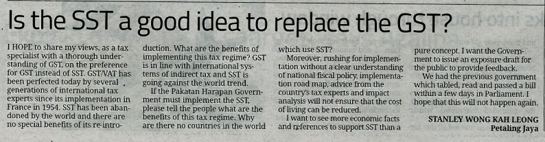 I HOPE to share my views, as a tax specialist with a thorough understanding of GST, on the preference for GST instead of SST. GST/VAT has been perfected today by several generations of international tax experts since its implementation in France in 1954. SST has been abandoned by the world and there are no special benefits of its re-introduction. What are the benefits of implementing this tax regime? GST is in line with international systems of indirect tax and SST is going against the world trend.